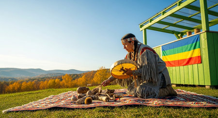A shaman is deeply engaged in a ritual, playing a drum amidst natural elements on a blanket. A rainbow flag waves in the background, with autumn trees adding color.
