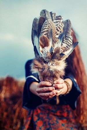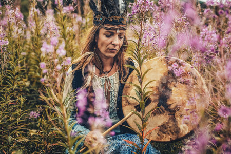 beautiful shamanic girl playing on shaman frame drum in the nature.