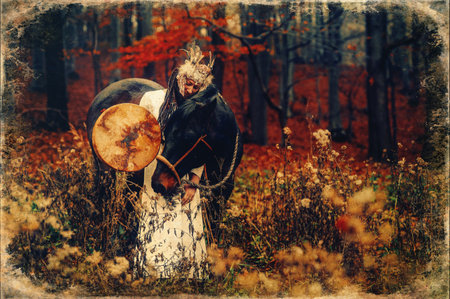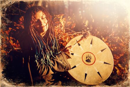 beautiful shamanic girl playing on shaman frame drum in the nature, old photo effect.