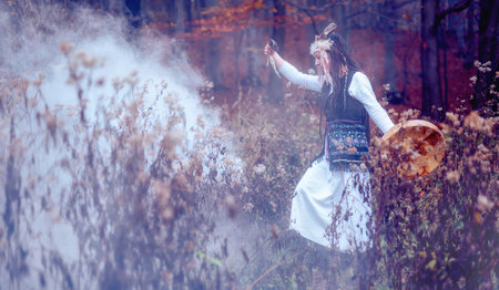 Portrait of a shaman woman in ethnic dress and deer antlers headdress performing a mysterious ritual dance in a forest. Fairy forest witch. Fantasy. Halloween.