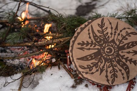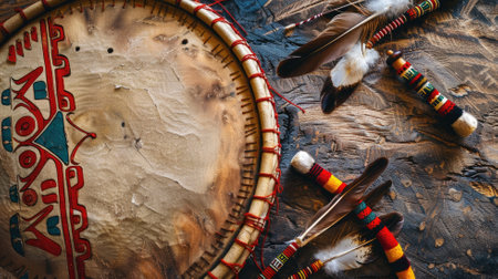 A shaman drum with intricate designs used in spiritual rituals to connect with the spirit world. Concept Spiritual Rituals, Shaman Drum, Intricate Designs, Connection with Spirit World
