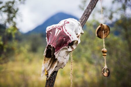 Red color painted animal scull on wooden triangle outdoor. Black magic voodoo ritual