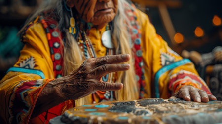 Native American Heritage Month. A close-up shot of a Native American storytellers hands gesturing as they weave a tale, their words transporting listeners to a world of ancient myths and legends.