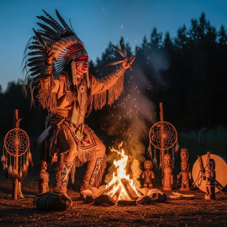 A Native American shaman performing a sacred ritual in a forest clearing, surrounded by traditional totems.