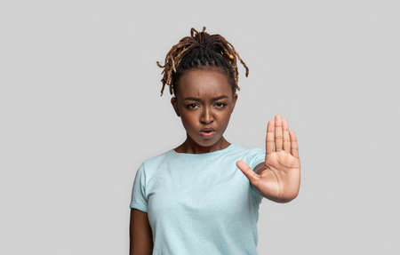 Angry african girl showing stop gesture over grey studio background, violence against women
