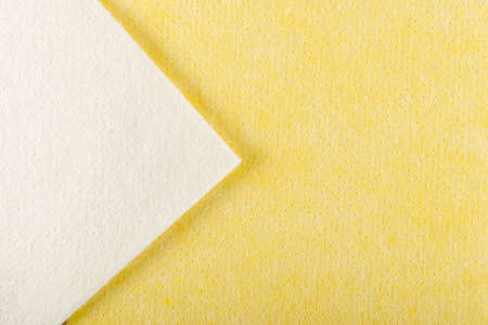 Microfiber cloth on yellow background, top view. Spring cleaning and household concept. Advertising space with copy space, flat lay.
