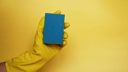 Sponge for washing dishes in hand. Hand in a latex glove isolated. A hand in a glove holds a sponge for washing and cleaning on yellow background