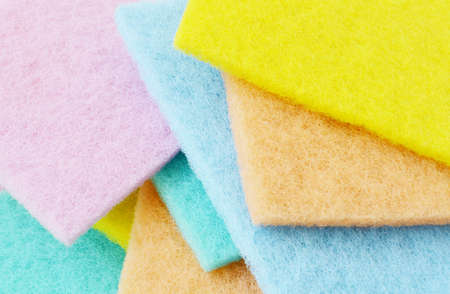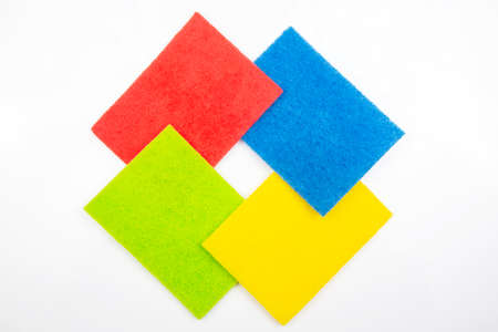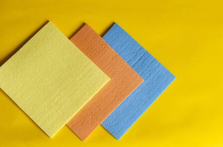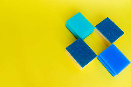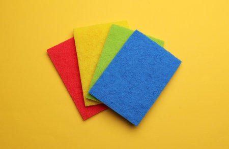 Dish washing sponges of different colors are on a yellow background. High quality photo