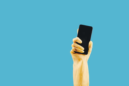 hand in a yellow rubber glove holds a yellow sponge for washing dishes and cleaning, blue background copy space, cleaning concept, household chores, spring cleaning