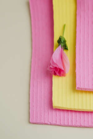 Kitchen napkins for cleaning on a yellow background. Geometric figure from kitchen napkins. Three multi-colored napkins for dishes. Home routine and commercial cleaning company. Selective focus.