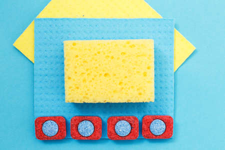 capsules for dishwashers, kitchen rags and sponges on a blue background. flat lay.