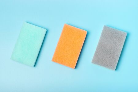 Three multi-colored sponges on blue background, view from above, a concept of spring cleaning