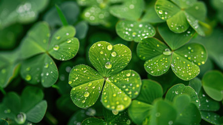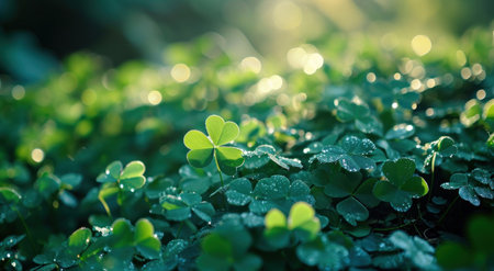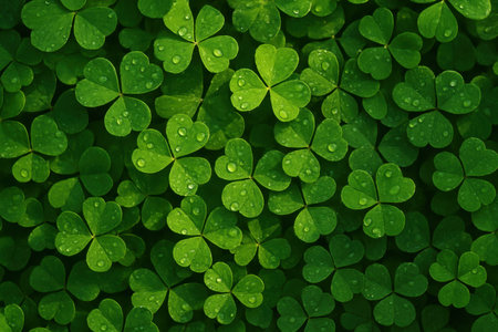 Fresh green clover leaves covered in glistening morning dew droplets, forming a dense natural carpet. symbolizes nature, growth, freshness, and good luck.