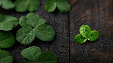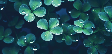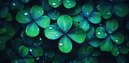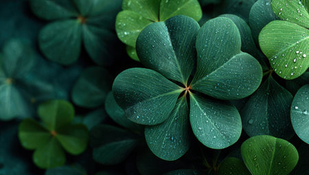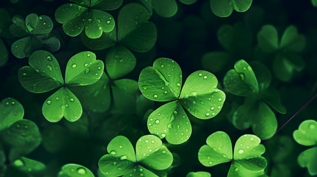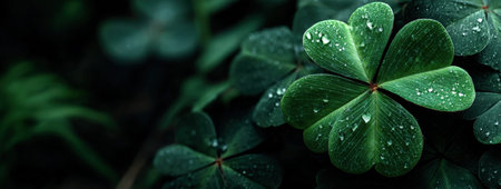 Lush green shamrocks with water droplets are set against a dark background, ideal for St. Patrick's Day themes and decorative purposes
