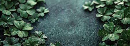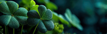 Banner design showcases three four leaf clovers surrounded by rich green foliage, creating a vibrant and natural look ideal for seasonal decorations