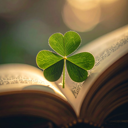 A single, fresh three-leaf clover rests between the pages of an open book, bathed in warm, golden light.