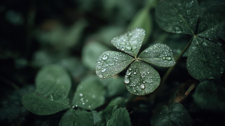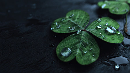 Close-up of a four leaf clover featuring lush green leaves adorned with water droplets against a dark background, representing good fortune and nature's beauty