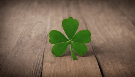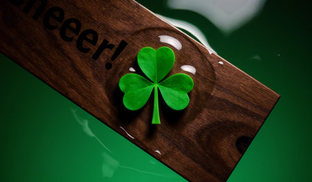 A bright green shamrock rests on a weathered wooden board, surrounded by reflective liquid. The scene captures the joyful spirit of luck and festivities, inviting celebration.
