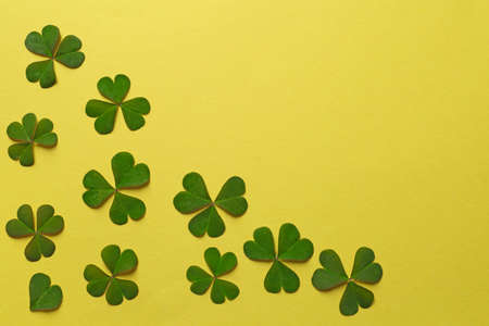 Green shamrock isolated on bright yellow background. Three leaf clover, top view. minimal concept. Symbol of St. Patrick's Day