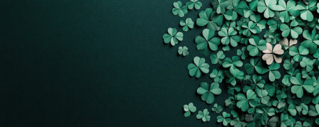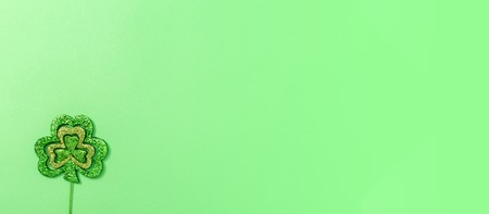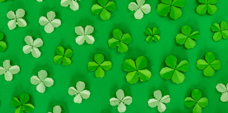 Saint Patrick's day banner with origami clovers leaves. Above view over a green background. Holiday symbol. Copy space.