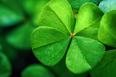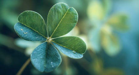 A lively four-leaf clover showcases intricate vein patterns against a rich green backdrop, evoking themes of fortune and harmony in a serene, nature-filled setting.