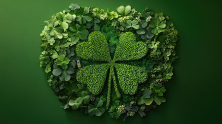 A vibrant arrangement of various green plants forms a four-leaf clover shape on a rich green backdrop, symbolizing luck and prosperity.