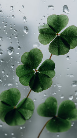 Green clover leaves with raindrops on the window. St. Patrick's Day background.