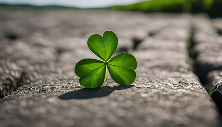 A single shamrock plant growing through the cracks in a stone path, showing the resilience of nature.