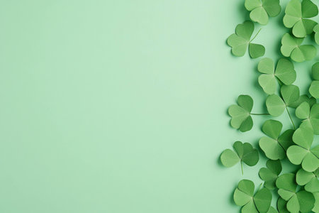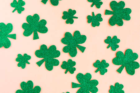 Green shamrocks arrangement on a pastel background for St Patrick s Day celebrations, symbolizing luck, nature, and the coming of spring