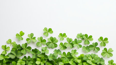 Fresh Green Shamrock Leaves Arranged on White Background Concept of St. Patrick's Day Nature and Irish Luck. Copy space.