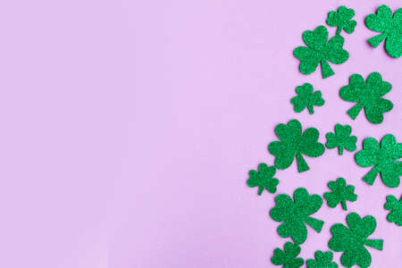 St. Patrick's Day side border paper shamrocks on purple background. Copy space for the text