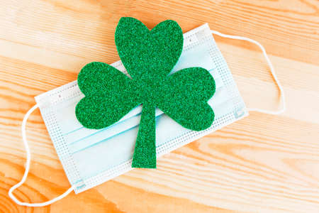 Face medical mask and shamrocks on wooden background, top view. Coronavirus Patrick's Day concept