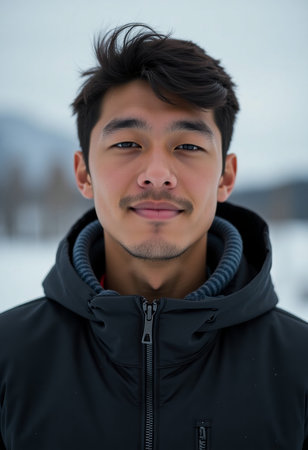 A year old Alaska Native man stands confidently against a snowy backdrop, showcasing a blend of rich cultural heritage and the stark beauty of the Alaskan wilderness.