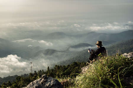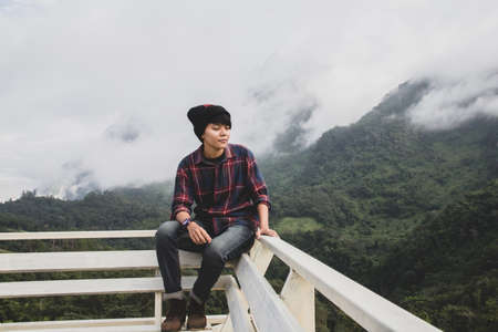 Asian young man in Scottish shirt and black hat sitting at mountain peak with clouds and fog outdoor hiker. Doi Luang Chiang Dao Chiang Mai, In morning.