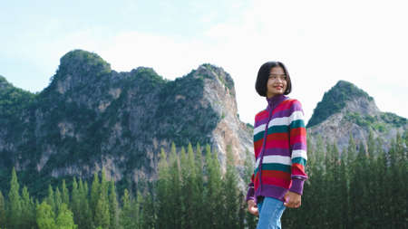 Generative AI Image of Photo of Asian Man with Smiling Expression Exploring Mountain in the Morning