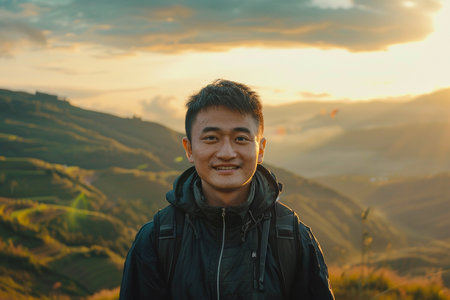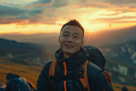 Generative AI Image of Photo of Asian Male Climber with Smiling Expression in Mountains at Sunset