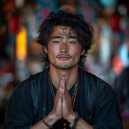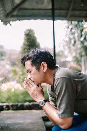 A thoughtful young man sits quietly outdoors, eyes closed and hands clasped in a gesture of prayer or deep contemplation. He finds peace and introspection in the serene natural environment.