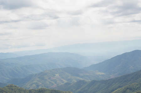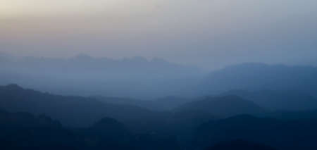Panorama landscapes of foggy mountains in morning time on mysterious background. Nature in the evening before the sunset behind the mountain. Doi Phu kha National park of thailand.