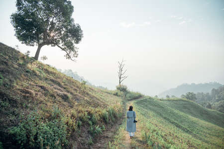 Rear view of a woman with her camera walking on the dirt road at sunrise time.