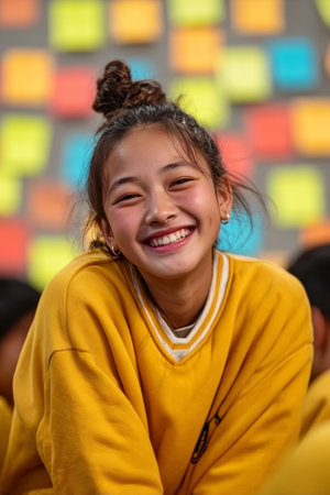 Joyful Chinese Teenager Radiates Positivity in Collaborative Classroom with Colorful Sticky Notes
