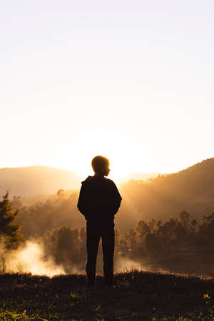 Silhouette of a young boy standing in the fields and the beautiful mountains in the background captured during sunset.