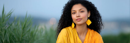 Portrait of a woman in yellow outfit with matching earrings standing outdoors near green plants at sunset. High quality photo