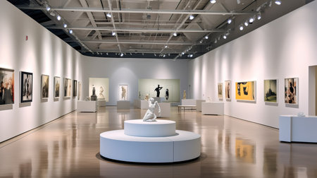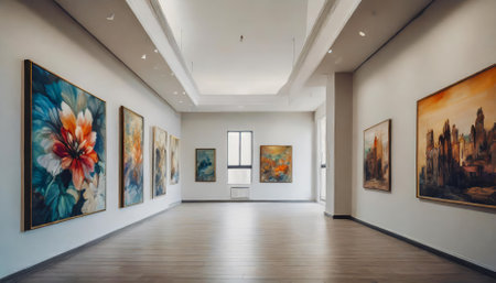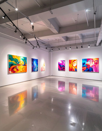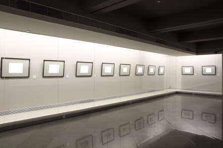 People looking at paintings on white wall in Art exhibition gallery. Blurry background.