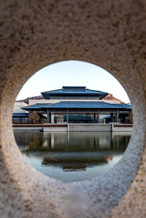 Chengdu China, 6 August 2019 : Exterior view of the Jinsha site museum Exhibition Hall building in Chengdu Sichuan China