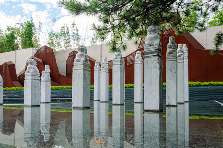HANGZHOU, CHINA - JULY 03, 2017: A landscape composition featuring a row of traditional stone hitting posts standing in a reflective water pool. Overhanging pine branches and a rusty steel background complete the modern Zen aesthetic.