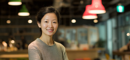 A woman smiles while standing in a modern office space. Colorful light fixtures hang above her. The room has a bright and open atmosphere. People are working in the background.