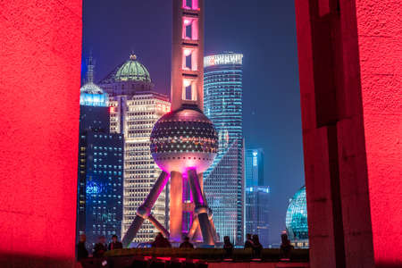 SHANGHAI, CHINA, OCTOBER 27: This is a night view of the Oriental Pearl Tower framed through the Monument to the People's Heroes on October 27, 2019 in Shanghai