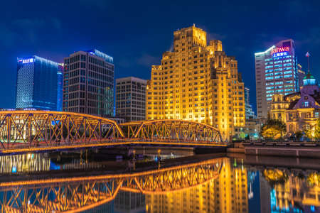 SHANGHAI, CHINA, OCTOBER 27: Night view of the Waibaidu Bridge and riverside city buildings in Suzhou Creek on October 27, 2019 in Shanghai