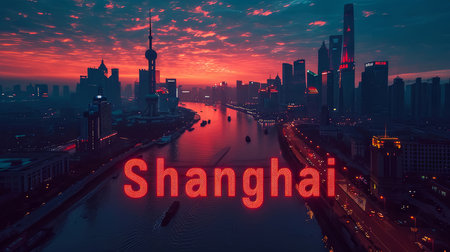 Stunning aerial shot capturing the vibrant sunset over Shanghai's skyline, showcasing modern architecture and bustling city life.
