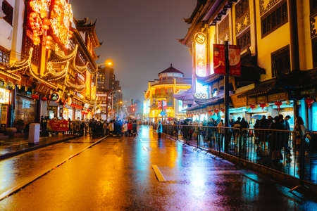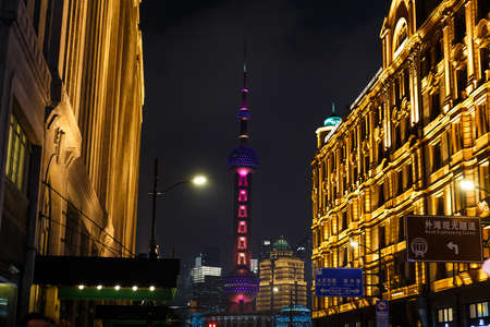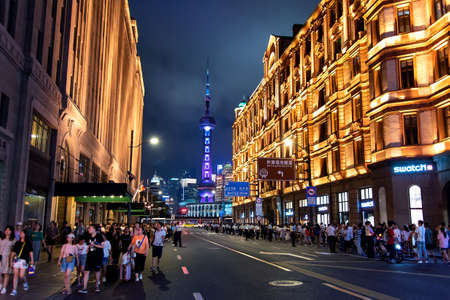 Shanghai, China - August 7, 2019: Busy streets of Shanghai with modern and traditional architecture and tourists walking to the Bund scenic viewpoint at night